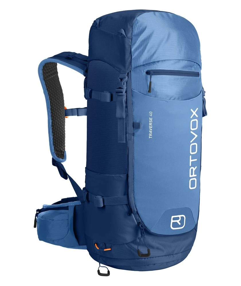 Auch technisch hat der TRAVERSE 40 einiges zu bieten: neben einem geräumigen Hauptfach bietet die Deckeltasche und das zusätzliche Bodenfach genügend Stauraum für Mehrtagestouren. In der weitenregulierbaren Fronttasche sind Kleinigkeiten schnell verstaut. Durch den umlaufenden Frontreißverschluss lässt sich der TRAVERSE 40 komplett aufklappen und bietet so einen guten Überblick auf die Ausrüstung. Die Trinkflasche ist in den elastischen Seitenfächern immer griffbereit, genauso wie die Karte im speziellen Kartenfach. Ein integriertes Helmnetz, verstaubare Materialschlaufen am Ende der Schulterträger sowie Stock– und Skibefestigungsmöglichkeiten machen den TRAVERSE 40 zum optimalen Begleiter im alpinen Gelände. Weitere Features wie die Trinksystemvorbereitung, Regenhülle, Hüfttasche und eine Halterung für beispielsweise Sonnenbrille oder Kamera am Schulterträger runden den vielseitigen Rucksack ab.